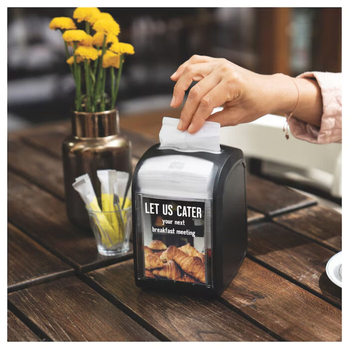Tork Xpressnap Fit Masa Üstü Peçete Dispenseri sayesinde kalabalık restoranınızda peçete israfını yarıya indirin. Yüksek kapasiteli dispenserimizle dolumlar arasında Tork Fastfold peçetelere göre %90 daha fazla konuğa hizmet verebilirsiniz. Kullanışlı dolum göstergesi personelinizin de işini kolaylaştırır. Az yer kaplayan tasarım hem masalarınıza ferahlık katar hem özelleştirilebilir bir reklam alanı sunar. Sürdürülebilir ve %100 geri dönüştürülmüş peçetelerimiz ise çevreye duyarlılığınızı yansıtır.